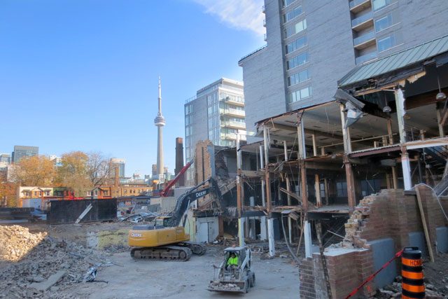 The experience with Kim reminded me of this set of photos I took last fall. This site, which was one that we had to cross the road to get past, is currently a huge hole in the ground, where layers of underground parking are being built, which will be topped by 17 stories of housing. (It is this building.) These shots of of the demolition of the building they had to take down in order to construct the new one.
