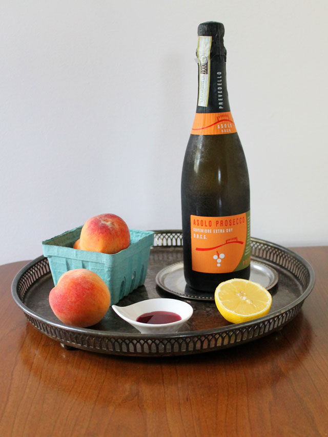 With peaches on the brain after Nick brought home a basket of beauties from the market last weekend, we decided to pop open the bottle of sparkling wine (Asolo Prosecco) we had chilling in the fridge and make some, outdoors on a lovely Sunday afternoon.