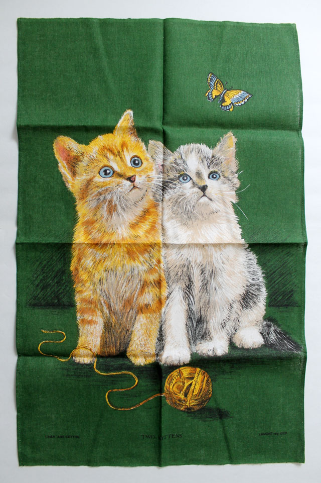 Having been interested in vintage tea-towels for a while, I know that the find of the day was the one with kittens on it. It is probably from the 50s or 60s and tea-towels from back then, with images of cute animals on them are treasured by collectors, so that one has been stored away in a cabinet until I decide what to do with it, while the other two are in rotation in our kitchen.