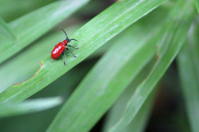 When I spotted this bright red insect in the garden, I thought it looked interesting, with its bright shiny red wings, so I snapped a few shots. Later that evening I told Nick about what I'd seen, mentioning that it had been on my lily plant. At the time I had no idea that the only reason it was in our garden at all, was because of that specific plant. Upon looking up the term 'bright red beetle', I immediately found it. This is a Scarlet Lily Beetle, and they live to eat lily plants.