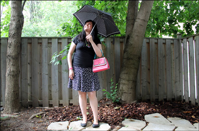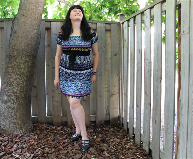 My dress is a new one that I picked up in a little mall connected to the subway station near my doctor's office, when I went for my physical a couple of weeks ago. My first 'real' job after university was in a building on the same corner, which is why my doctor is located up there. She is so good that I never looked for a doctor closer to my downtown home(s) once I left that job many moons ago! Anyway, I don't mind making the trek to her office because of that small mall! It has a number of tiny independent boutiques in it that I like to have a look in. I thought this little elastic shirred bodice dress would be perfect for the imaginary beach vacation that I am planning in my head, so I picked one up in my first (and typical) choice of a classic black and white colour scheme. Then, after shopping in a couple of other stores, I went back and got this multi-coloured one too. I was actually thinking of my on-line friend Vix when I did because I really like all the colours she wears.