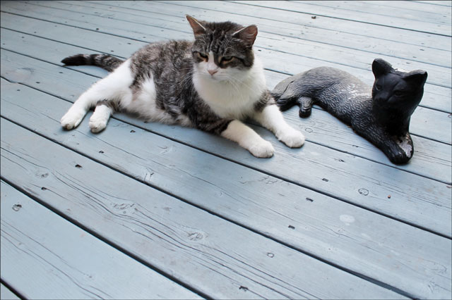 So while we would have loved to get another cat, I'm afraid that Ed is one of those pets who "do best in a one cat household". However these pictures prove that he doesn't dislike all cats. He gets along just fine with his friend, Statue -- Stu, for short.