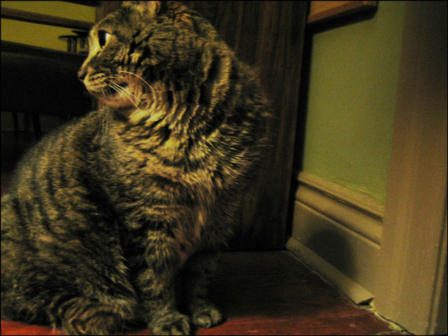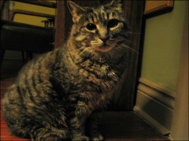 This big guy has the thickest fur I have ever seen on a cat, making him very cuddly, but don't try to pick him up! While he is very friendly and happy to be petted and scratched under the chin, he simply will not tolerate being lifted from the ground. He likes to have four paws on the ground.