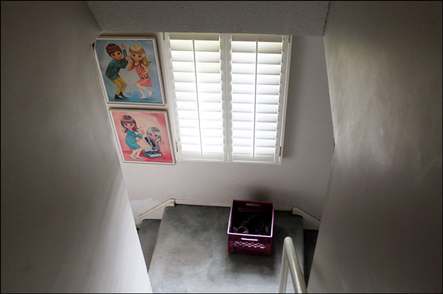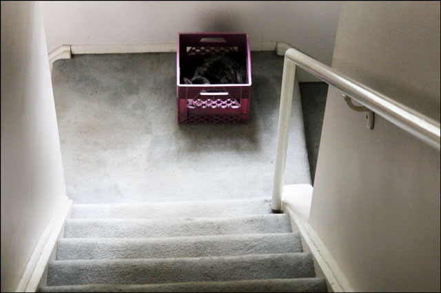 This old milk-crate had found a temporary home on the landing, as we were moving some in our storage area. Somebody thought it was really cool.