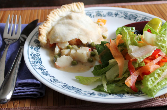 As I type we have 2 large ones and 2 single size portions tucked into our freezer, (frozen before baking), awaiting a future indulgence in a decadent lunch. The ones we have sampled were delicious, with the subtle taste of lobster infused within the sauce. Granted there were only a few pieces of actual lobster in each serving but what was there turned what would be plain vegetable pies into something a little more special.