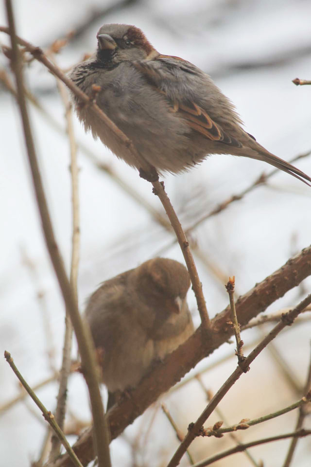 Because we love our little sparrow friends (previously seen here and here). Just like 'our' squirrels (seen here, here and here) we see them as our own pets who, of course, aren't really pets. They are the wild ones that stick around our yard the whole year long, to be glimpsed at from our windows and laughed at because they do funny animal things.