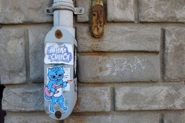 (1) I'm glad I got a picture of this cat sticker above when I did, stopping and fumbling to get at my camera out as both my hands were occupied holding heavy grocery bags, because when I passed the spot again a few days later the sticker had been partially peeled off and ruined.