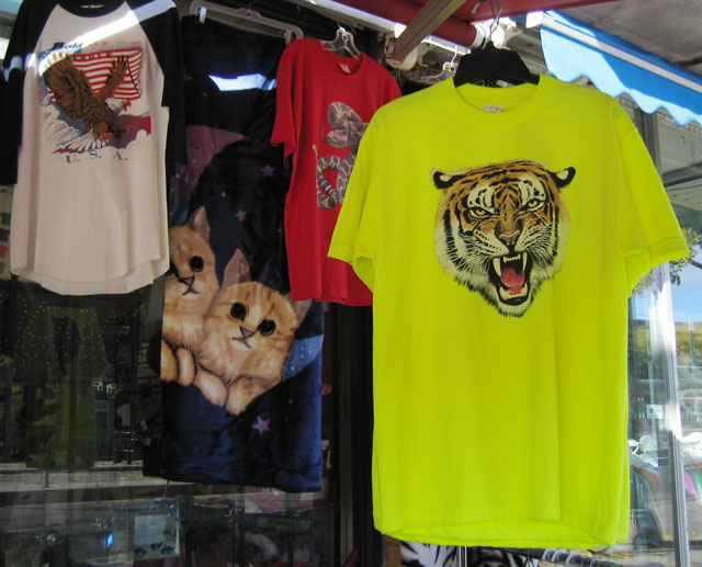 (2) Here are a tiger tee-shirt and a fleece blanket with kittens on it spotted in China Town. It is strange that they are also selling a USA souvenir shirt here in Toronto.