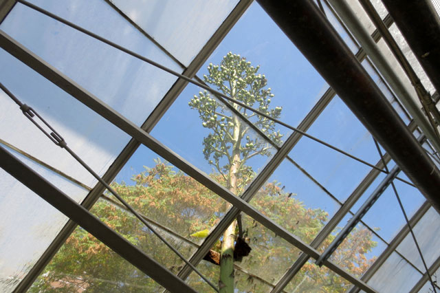 Then suddenly in early spring the gardeners noticed that something was up with the Agave plant. It had sent up a shoot, that began a rapid growth spurt skyward. It quickly became clear that the sprout would soon be hampered by the glass ceiling, so they made the decision to break a small hole into the glass, so it could continue to grow. And grow it did, ultimately reaching a height of 2 metres above the greenhouse. And then this sprout bloomed brilliantly with yellow petals.