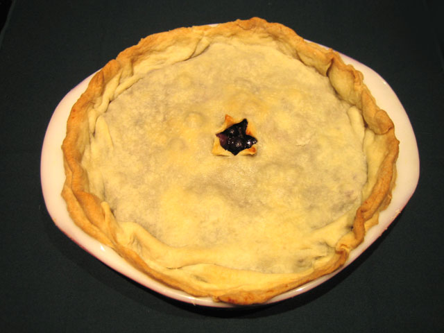 Rinse enough fresh blueberries to fill your crust right up. Our pie plate is a large deep-dish one, so we used 4 pints (about 2 cups). Mix the berries with 4 tablespoons flour, 1/2 cup sugar, a dash of cinnamon, 1 teaspoon grated lemon rind and 1 teaspoon fresh lemon juice. Toss around gently until well mixed. Pour into your prepared pie crust and dot with pieces of butter (about 3 tablespoons total). Top with your pie-crust lid and cut a hole in it.