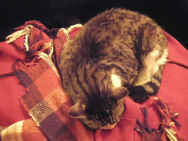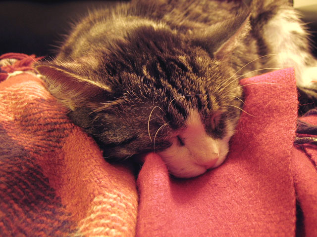 Eddie relaxing on some blankets. The plaid one has been in Nick's life forever and probably covered him as a newborn, as he was born in the middle of a snowstorm that was so bad that the electricity went out at the hospital, so he came into being under the lights provided by an emergency generator.
