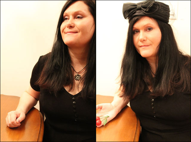 Anyway, for this session I was already dressed for something else so I popped a vintage hat on my head and grabbed some plastic cherries from my big bowl of fake fruit, and took my first tentative shots with my remote control.