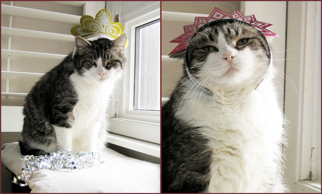 Saturday is Caturday! It is New Year's Eve so I helped Eddie pick out a party crown. He decided not to wear either of the choices because they were slipping off. In the end he went for some glittery ribbon curls. Yay Eddie =↑..↑=