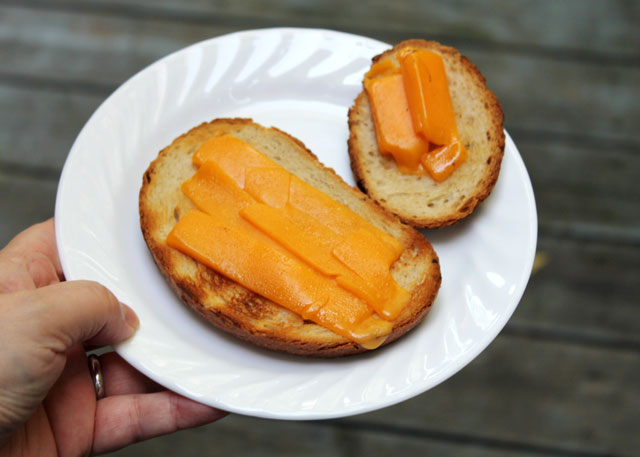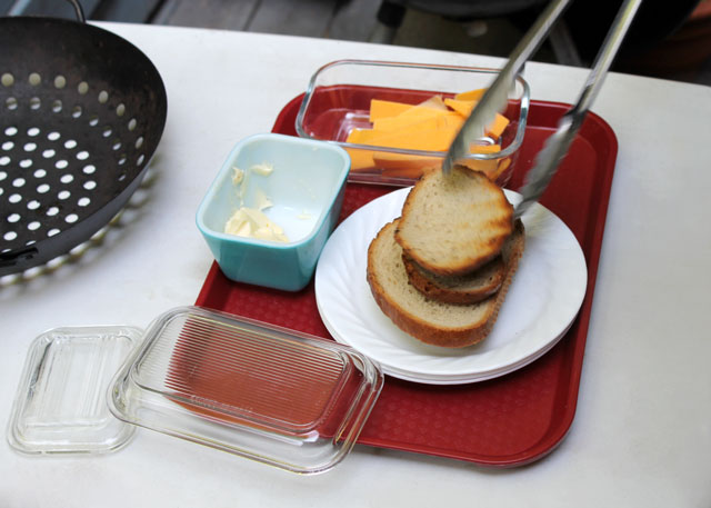 Here’s what he did : Put some bread (any kind will do but he used Rye) on a hot grill, trying to avoid putting it directly above the coals. Cover and turn it halfway, until it’s lightly toasted. Then remove it, butter it and lay on some cheese. Again, any kind that melts will do but we had some old cheddar. Return to the grill, cover and wait until it just begins to melt. The only things that can go wrong with this dish is that the toast might burn, so watch out for that.