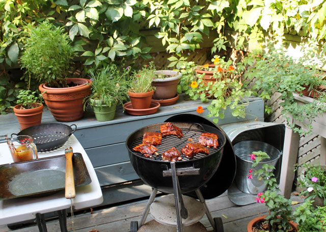 … and put some ribs on the hot grill, (that we had previously been par-boiled in a pot of water inside), and lightly coated them with a barbecue sauce made by mixing together Soy Sauce, Ketchup, Red Wine Vinegar, Hoisen Sauce, Dijon Mustard and Garlic and Onion Powders.