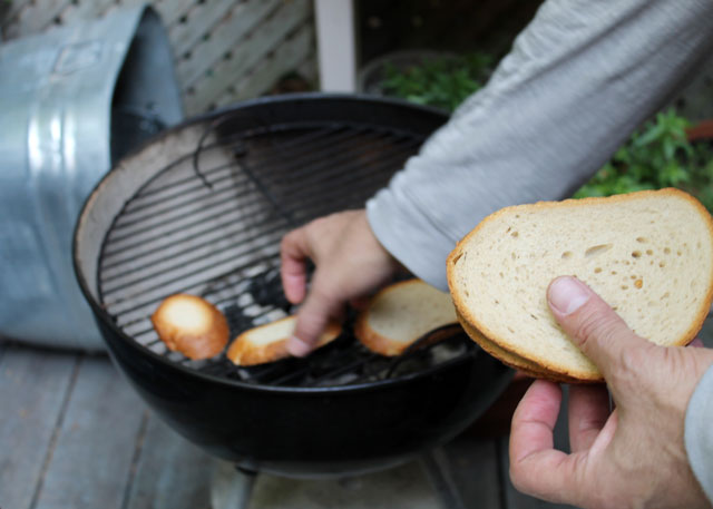 For an appetizer Nick whipped up one of my favourite things. Following a technique of his father’s he made melted cheese toast on the barbeque. To quote Andrea, ‘I could eat just this today and I’d be happy’. The smokey flavour that the charcoal grill adds to this simple snack makes it more delicious than its parts.