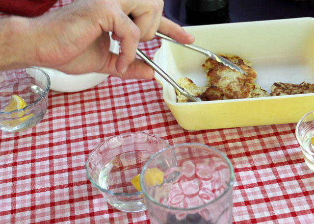 At this point Andrea nipped indoors to quickly fry some Potato Pancakes she was making, using this recipe from Smitten Kitchen. She had grated the potatoes an onions and prepared the batter soon after arriving and it had been resting in the fridge.