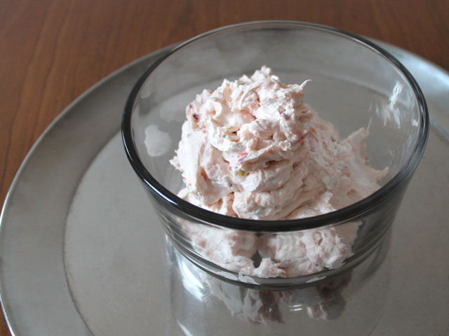 Smoked salmon is quite pricey here when you buy it in nice uniform slices, but something you might not know is that shops often sell the exact same salmon, but much less expensively, in ‘tidbit’ form. My guess is that these are the pieces of the salmon that are left, after the tidy slices are removed, but as far as your taste-buds go, it’s the same thing, only in a less attractive format. But who cares how it looks when you buy it, when you’re going to incorporate it into a spread!