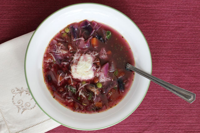 Over the years I have modified Baba’s recipe, to exclude the ground beef she used to put in it, but if you want the beef, just saute some, drain the fat, and add to the pot with the stock. I also switch between using green and red cabbage, as they have different nutrients and it’s good to include both in your diet (but note that using red cabbage adds a distinctive red hue to your finished dish, as seen in my pictures today.) The third change I made was to switch the white rice in Baba’s Recipe for Brown rice, because, of course, it is a more healthy choice, (but feel free to use white rice if it’s what you enjoy.) Finally, I add some beans to the mix (Kidney, Romano or Chick Peas, based on what we have on hand) for some protein and extra fibre.