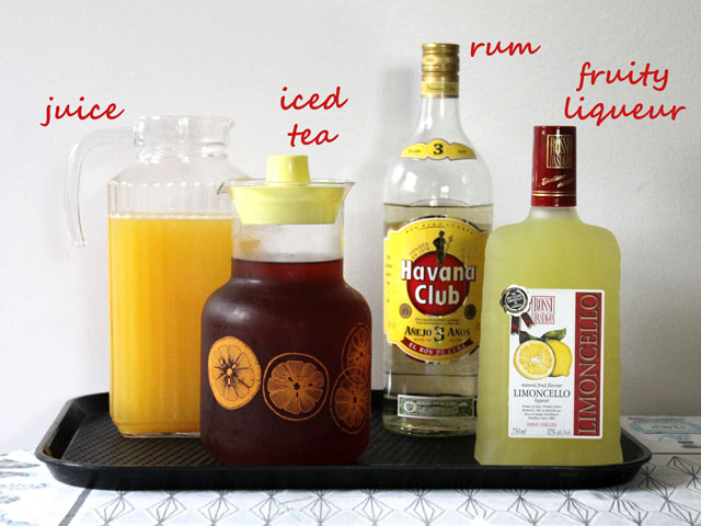 Then, in a large pitcher, mix 4 cups ice-tea, 2 cups juice, 1 cup rum and 1/2 cup liqueur together, and chill in the fridge. The punch can be made the evening before your party.