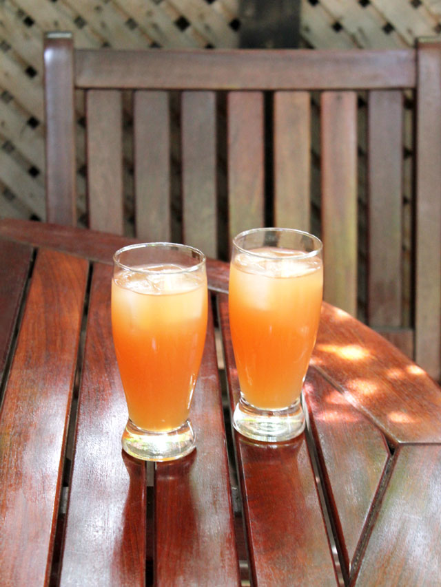 This is simple to mix up on the fly, once you’ve memorize the straightforward ratio of ingredients, each one being half the amount of the one before : 4 cups ice-tea, 2 cups tropical juice juice, 1 cup rum, 1/2 cup liqueur (or less, depending on how much alcohol you wish to include). Note the ratio, which declines by half with each ingredient — 4 to 2 to 1 to 1/2.