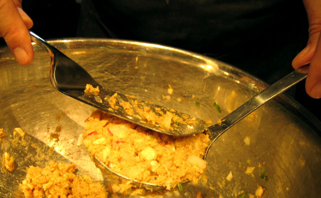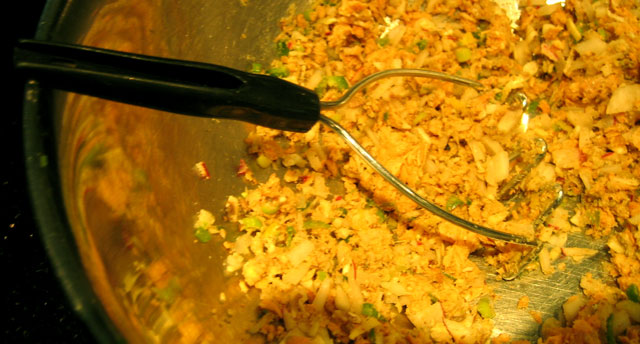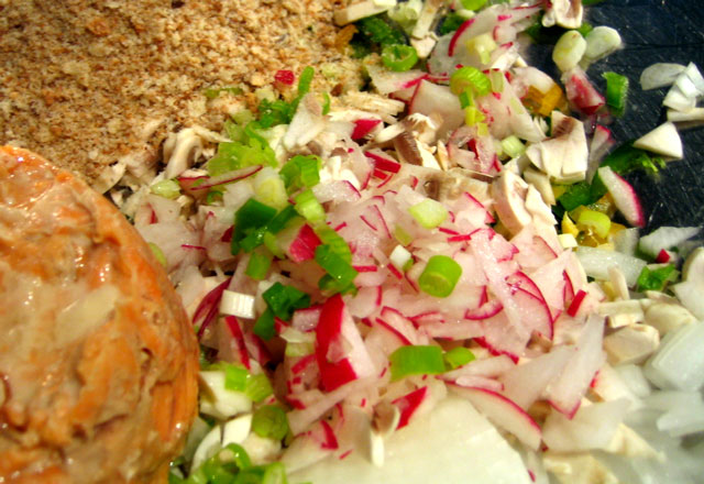 Mix together salmon, bread crumbs, garlic, lemon rind, salt & pepper, and additional vegetables.