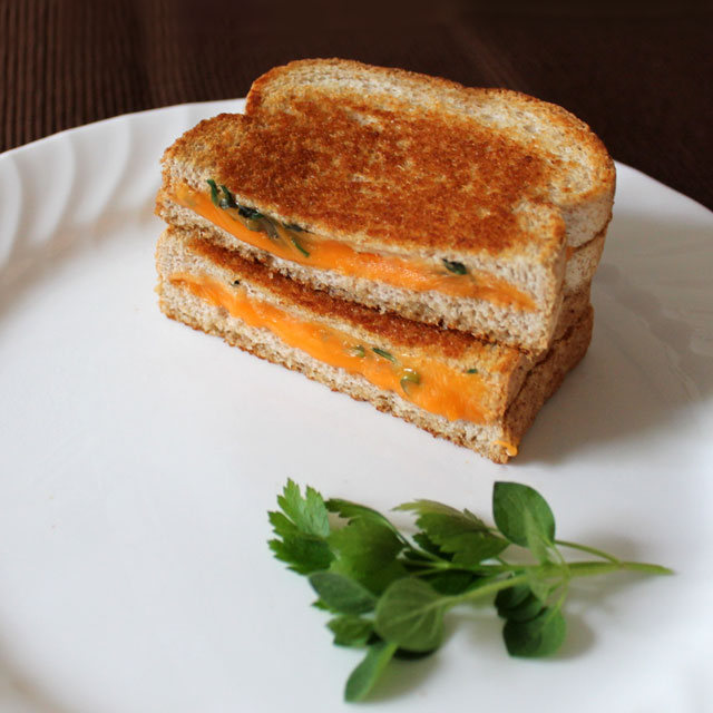 Of course, you know how to make a grilled cheese sandwich and I don’t mean to sound patronizing by telling you how, however, the method of making these is a bit different than what you normally do. This way works well whenever you want to put something more than only cheese in a grilled cheese, such as sliced tomatoes, sliced olives, or fresh herbs.