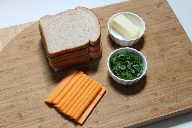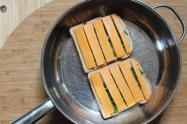 3 : Place the sliced cheese on top of the herbs. The reason you want the cheese on top of the herbs is so that it will melt and therefore stick the herbs to the bread. Otherwise, this sandwich is impossible to flip.