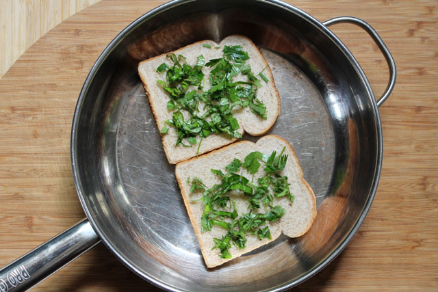2 : Place half your bread slices, buttered side down in a room-temperature frying pan, that has a lid. Put your finely chopped mixed fresh herbs on the bread.