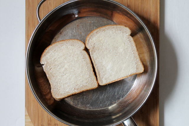 1 : Butter one side of each of your slices of bread. It’s much easier to get an even layer of butter if your butter is at room temperature. If it’s coming straight from the fridge, soften it with a brief moment in the microwave oven, OR melt about 1 teaspoon per side of bread in your pan. Then soak it up with one side of each piece of bread and remove to cool. Note : in the ingredients picture above, that is more butter than you need for one sandwich.