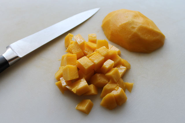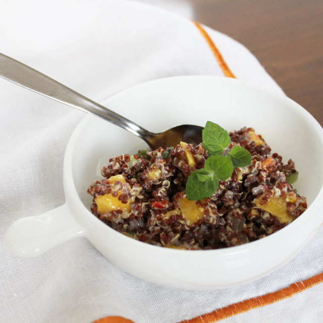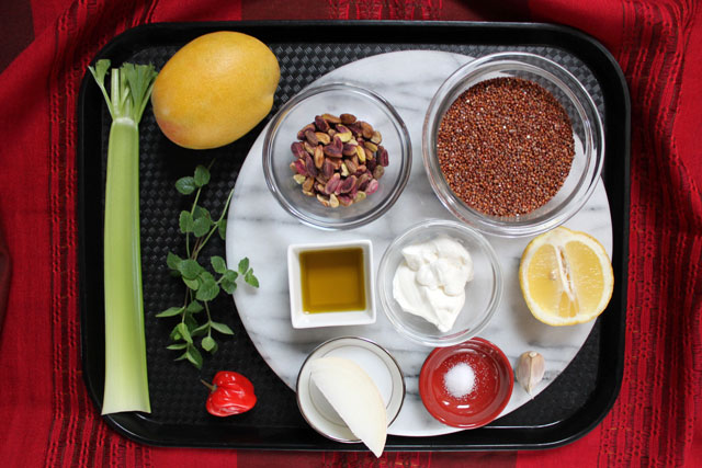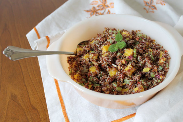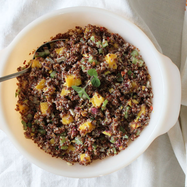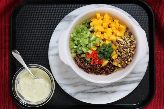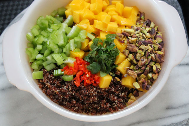 Add the nuts, mango pieces, celery, hot pepper and chopped fresh mint (or other fresh herb) to the cooked and slightly cooled quinoa.
