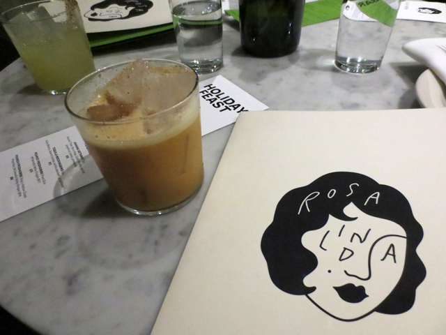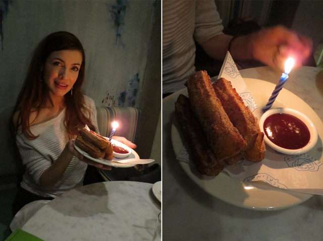 ↑ I’d mentioned we were celebrating a birthday when I’d made the reservation, so Julie’s dessert came aptly presented. Actually, we shared the Spice Churros with cinnamon sugar and chocolate banana caramel, and also shared a piece of Tres Leches Cake with grilled pineapple, mezcal caramel & coconut cream. ↑