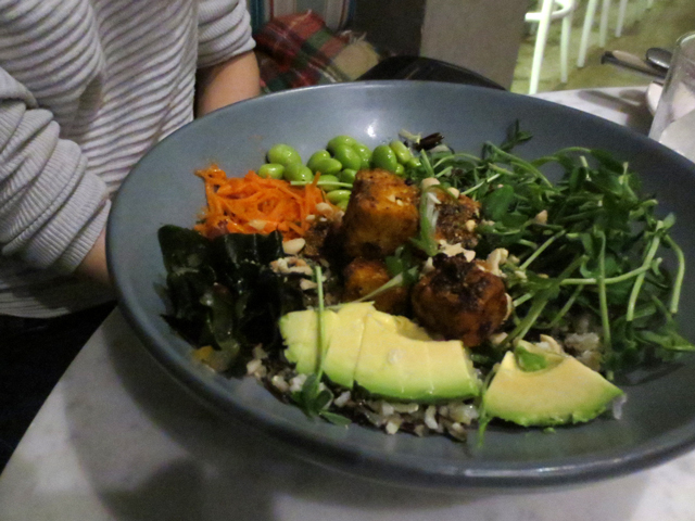 ↑ Julie chose the “Crispy tofu and Rice Bowl, with salsa macha, edamame, seaweed, avocado and chipotle-lime vinaigrette.” ↑