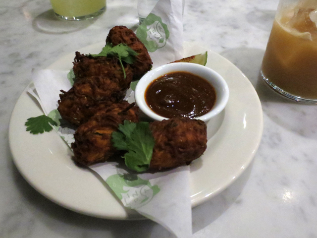 ↑ To eat shared a plate of “Veggie Fritters with a tamarind-ancho dipping sauce.” ↑