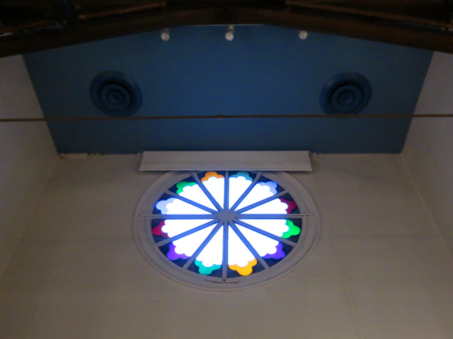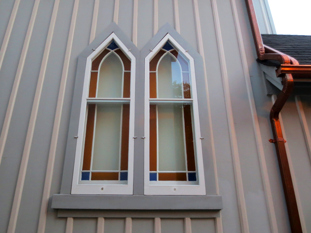 ↑ Hidden behind the wall panels inside are the original stained glass windows, which you can see from the outside. ↑