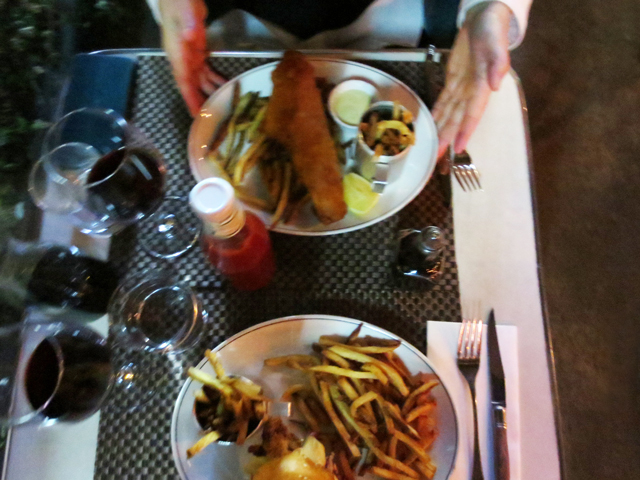 ↑ There’s a bad photo of our dinner, a chicken sandwich for me and fish and chips for Is. We shared a half-litre of Shiraz. ↑
