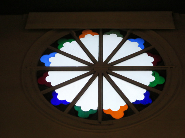 ↑ There was a blind covering the stained glass rose window when we entered, which they keep drawn because, situated as it is, facing west, the setting sun streams right in, making the whole place very hot. But he kindly rolled it up to give us a look. ↑
