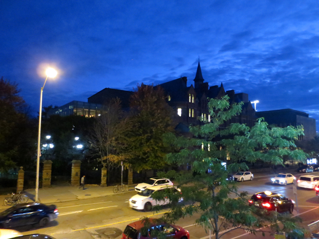 ↑ Across the street is the “Royal Ontario Museum” on the left, and the gates to “Philosopher’s Walk” to the right. (The gates were installed in 1901 to commemorate a royal visit, that of Prince George, Duke of Cornwall – later King George V, and Mary, Duchess of Cornwall – later Queen Mary, and later still, Queen Elizabeth’s Grandmother.) ↑
