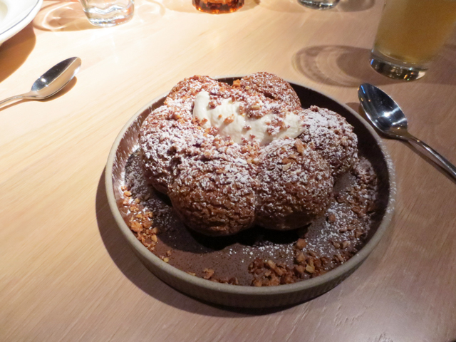 ↑ and “Bigne Alla Crema Paticcera : crispy choux pastry, espresso, chocolate, amaretto chantilly and almonds” for me. This was wonderful but huge, resulting in my first time ever taking some dessert home in a doggy bag! ↑