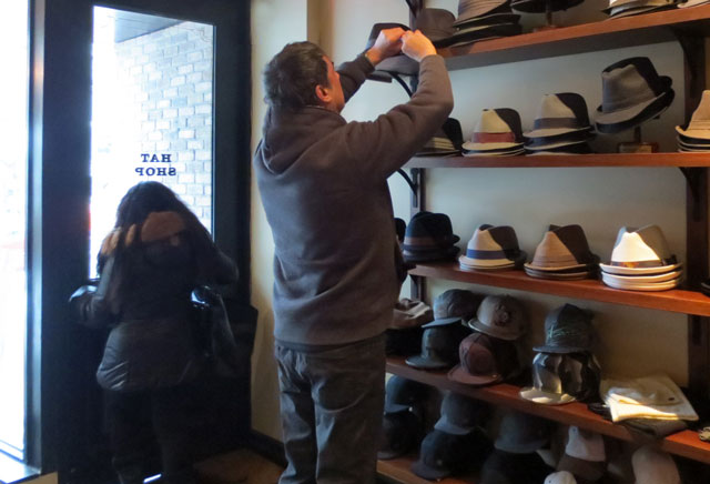 Last week I told you about this neat hat shop (here) that I’d found called Goorin Bros., where I had got Nick a fedora for Christmas. Well at the end of that post I’d mentioned that they were having a 50% off sale on some of their selections, and since there was an IOU in Nick’s gift bag earmarked for something that he got to pick out himself, we went over to have a look. I had originally meant the IOU to go towards a sports jacket, but he politely declined, saying he didn’t think he would get that much wear out of one.