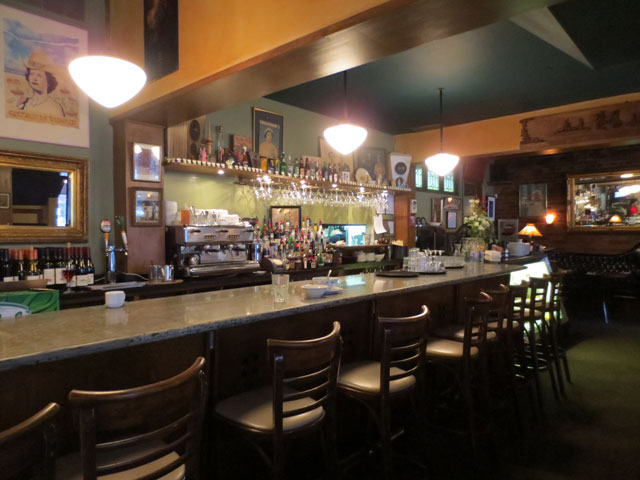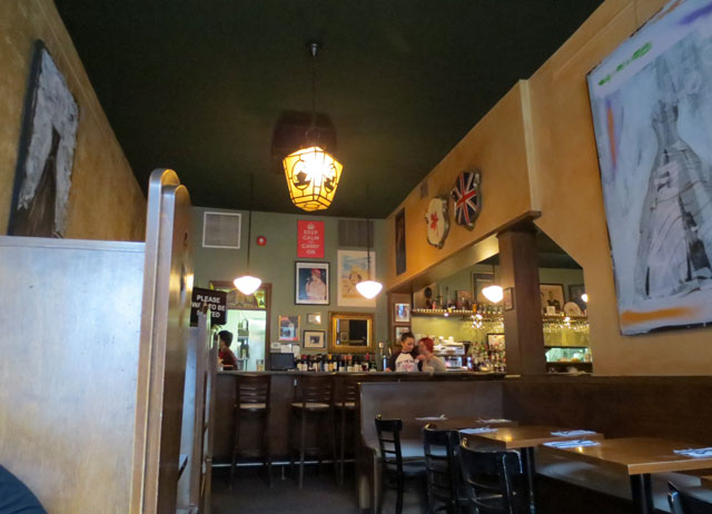 Since the hat shop was in the direction of one of my favourite old restaurants on Queens Street West, The Queen Mother, we went there for a late lunch. We actually timed the whole outing so that we could go there at an odd hour for eating, because the place gets totally jammed at lunchtime, and we wanted a nice leisurely lunch, hopefully in one of their nice booths.