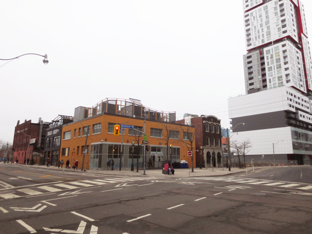 ↑ Looking back towards Richmond and Peter. The new building was recently added over-top of the historic building, which was also fully restored. There’s a write-up about the project here – The Toronto Star.