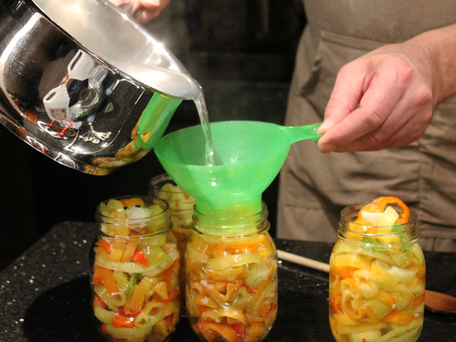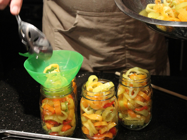 Use slotted spoon to remove peppers and place in prepared and boil sterilized mason jars. Plan for about 6 large mason jars.