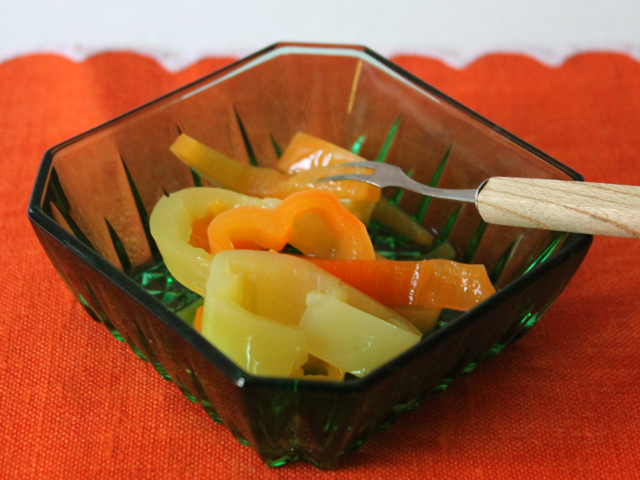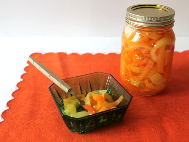 While your pot is coming to a boil, cut your large peppers into rings or strips. Remove the stalks and seed pulp. You can leave small peppers whole (jalapenos, mini sweets). However, Scotch Bonnet peppers should be cleaned of stalks and seeds and sliced into quarters. All the peppers eventually taste pretty much the same after they have been jarred together.