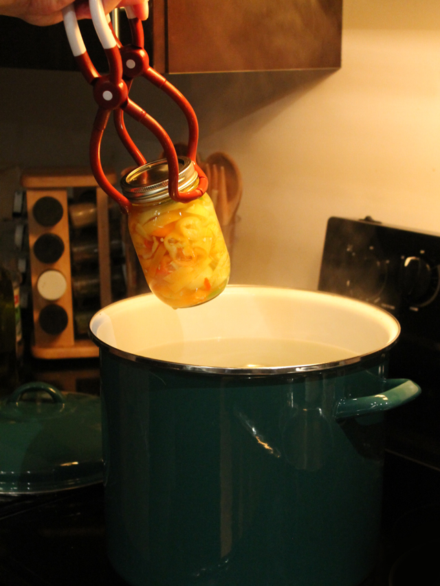 Place the sealed jars into a canning boil for 10 minutes. If using smaller jars, reduce the canning boil to 7 minutes. If you boil for too long the peppers can become soft in my experience.