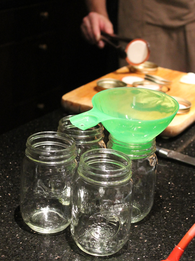 Add the sliced pickle cucumbers to each jar. Press as many in to each jar as you can without crushing the fruit.