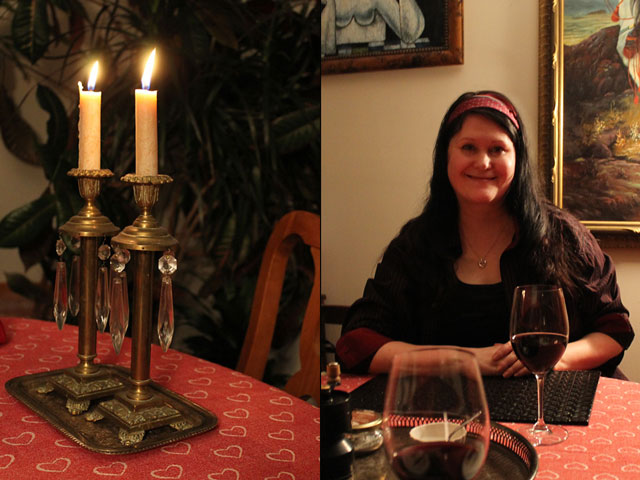 The tablecloth with the hearts on it is something I got on sale the first year we were married, in the ‘leftovers from Valentine’s Day’ section at Winners. It gets pulled out for the week of our anniversary and, of course, for Valentine’s Day every year. I remember when I bought it, along with 4 matching napkins, that I had no idea how often we would use such a thing but it was inexpensive and the newly-wed in me took it home with dreams of many romantic dinners to come. In hindsight I am glad I got it way back then, as it has been an enjoyable little detail to have in our lives, which has now come to signify many happy years together.