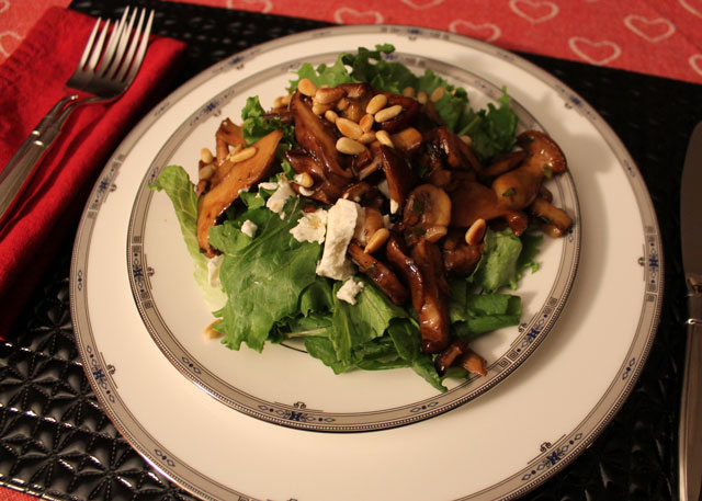 Then I prepared the mushrooms for an appetizer of Warm Mushroom Salad with Goat Cheese and Pine-nuts (shown here … we actually had enough ingredients left so that I could make more the following day, and then take new pictures in daylight to illustrate that recipe.)