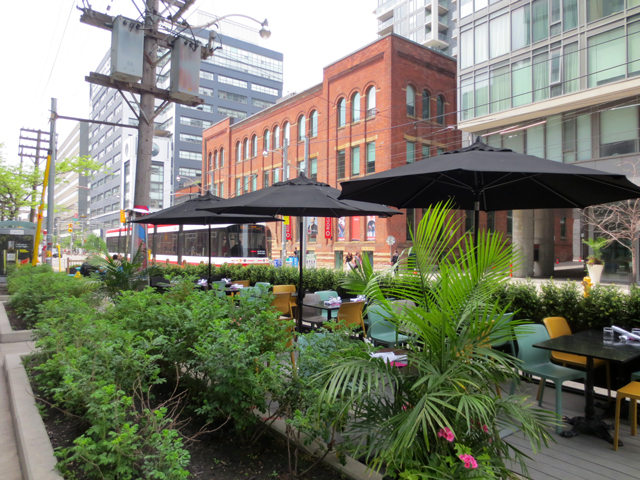 While speaking about the up-side of the condo boom in Toronto, I must add how much we are appreciating the new bylaw that prohibits regular motor traffic on King Street. As a user of public transit, it has changed my life, making getting places so much faster. It has also made way for outdoor patios, including this one belonging to Oretta.