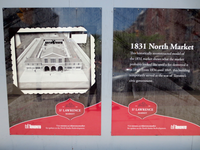 ↑ As seen from Front Street, here is the back of “St. Lawrence Hall”, with the empty lot where the north market once was. The grey fencing surrounds the construction site. ↑